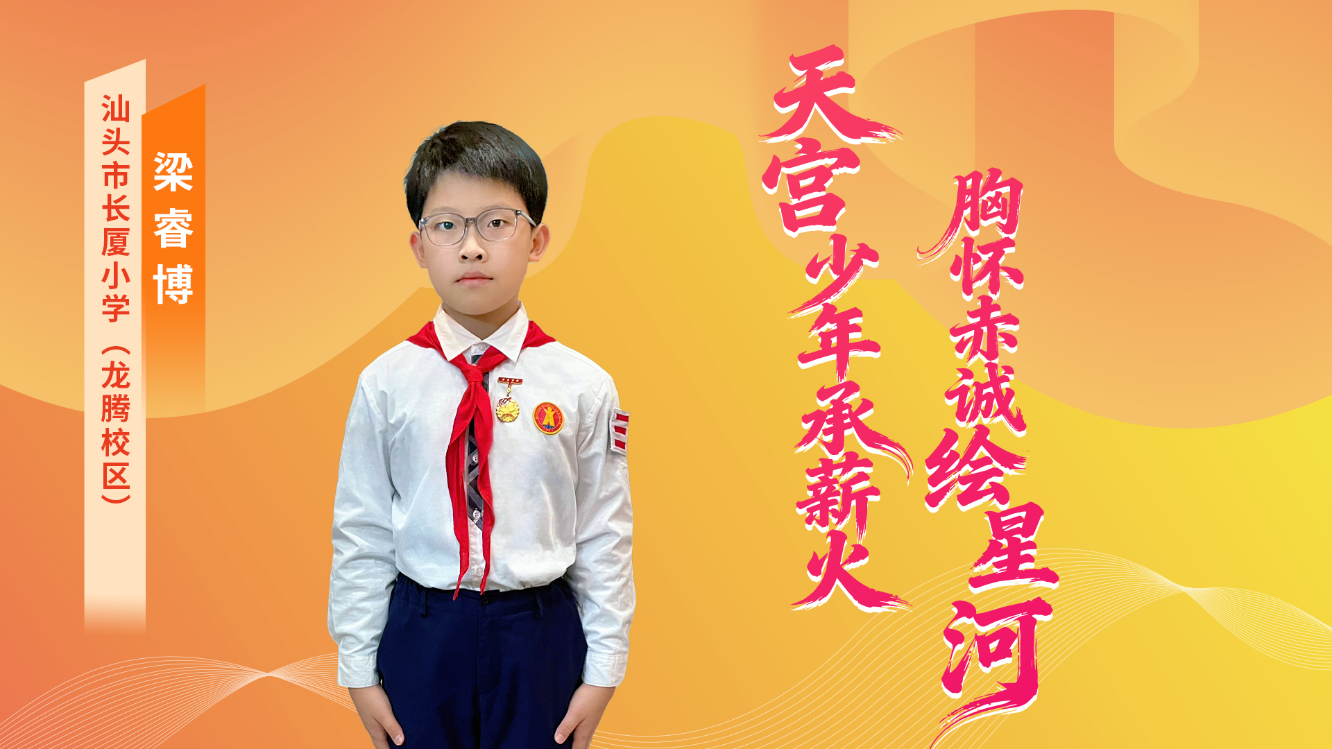 梁睿博,广东省汕头市长厦小学(龙腾校区)602班班长、学校少先队大队长。作为少先队汕头市第八次代表大会代表、主席团成员及汕头市第八届少工委委员,他积极参与青少年事务决策与建言。同时,他是汕头市新时代好少年宣讲团成员、金平区儿童议事会成员,曾获广东省第八届“最美南粤少年”、2024年汕头“新时代好少年”、潮汕星河奖品德奖、红领巾奖章四星章等荣誉。在科技创新领域,其航天主题画作随神舟十五号飞船进入中国空间站展出,并获全国一等奖;在公益领域,他坚持参与联合国儿童基金会月捐项目,连续多年获贡献荣誉证书。2025年入选广东“新时代好少年”先进事迹发布名单。
